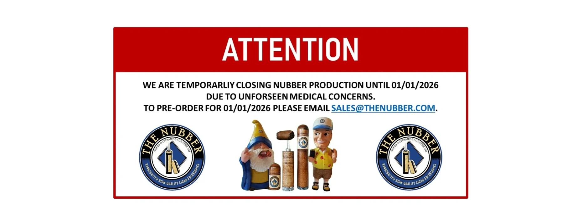 WE ARE TEMPORARLIY CLOSING NUBBER PRODUCTION UNTIL 01/01/2026